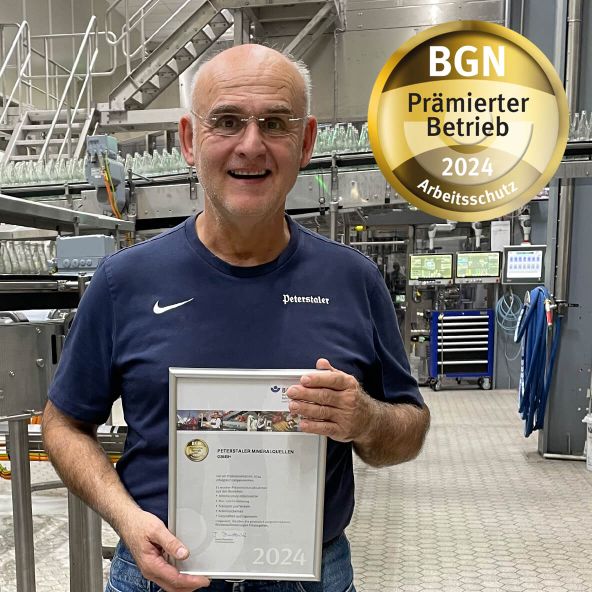 Bild: Thomas Lehmann, Fachkraft für Arbeitssicherheit bei Peterstaler, freut sich über die Urkunde der Berufsgenossenschaft