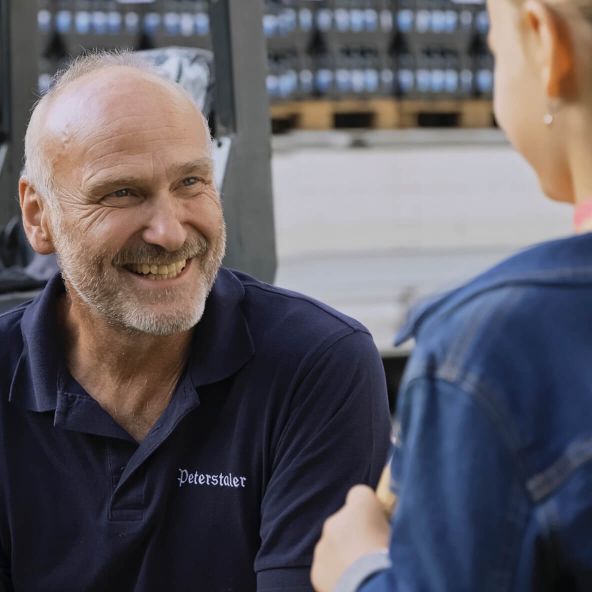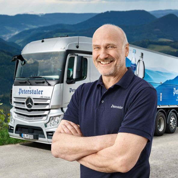 Andy Huber - Er ist stolz auf das, was er auf seinem 40-Tonner transportiert. Das gute Mineralwasser der Peterstaler Mineralquellen. Denn für ihn ist es das beste Wasser. Er trinkt es selbst am liebsten. Andy Huber fährt seit 35 Jahren Peterstaler Mineralwasser in alle Himmelsrichtungen.